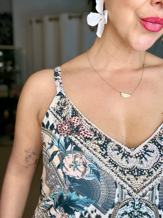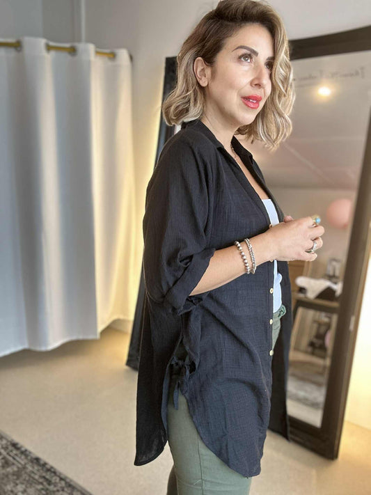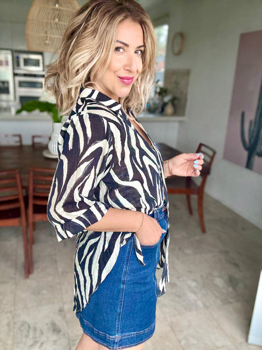 CELIA - BLACK & WHITE PRINT long line curved hem shirt with side ties
