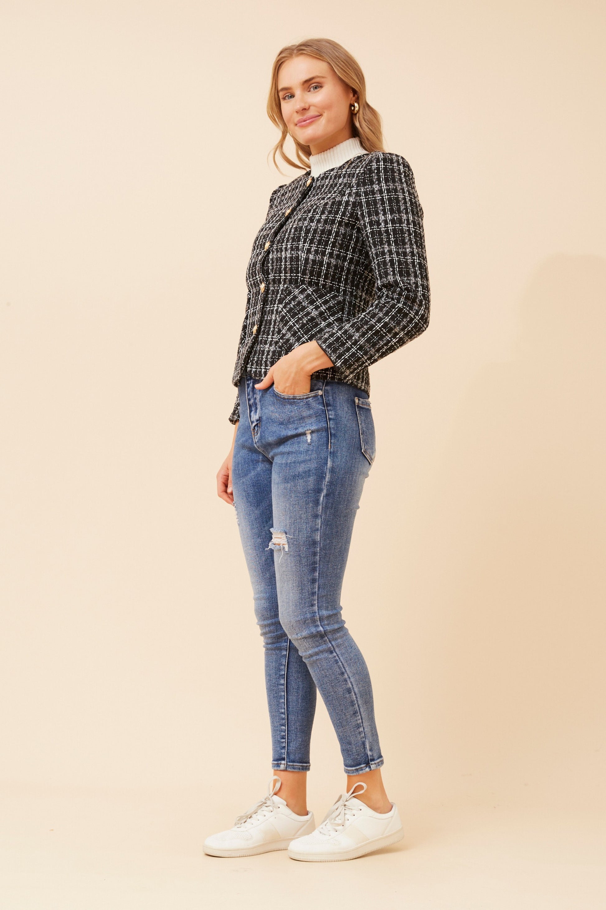 Upgrade your wardrobe with COCO, the perfect combination of sophistication and elegance. This black and white metallic blazer features stunning gold buttons, adding a touch of luxury to any outfit. Pair it with jeans and heels for a classic look, or with our vegan leather skirt for a sexy twist. A must-have to have this classic in your wardrobe