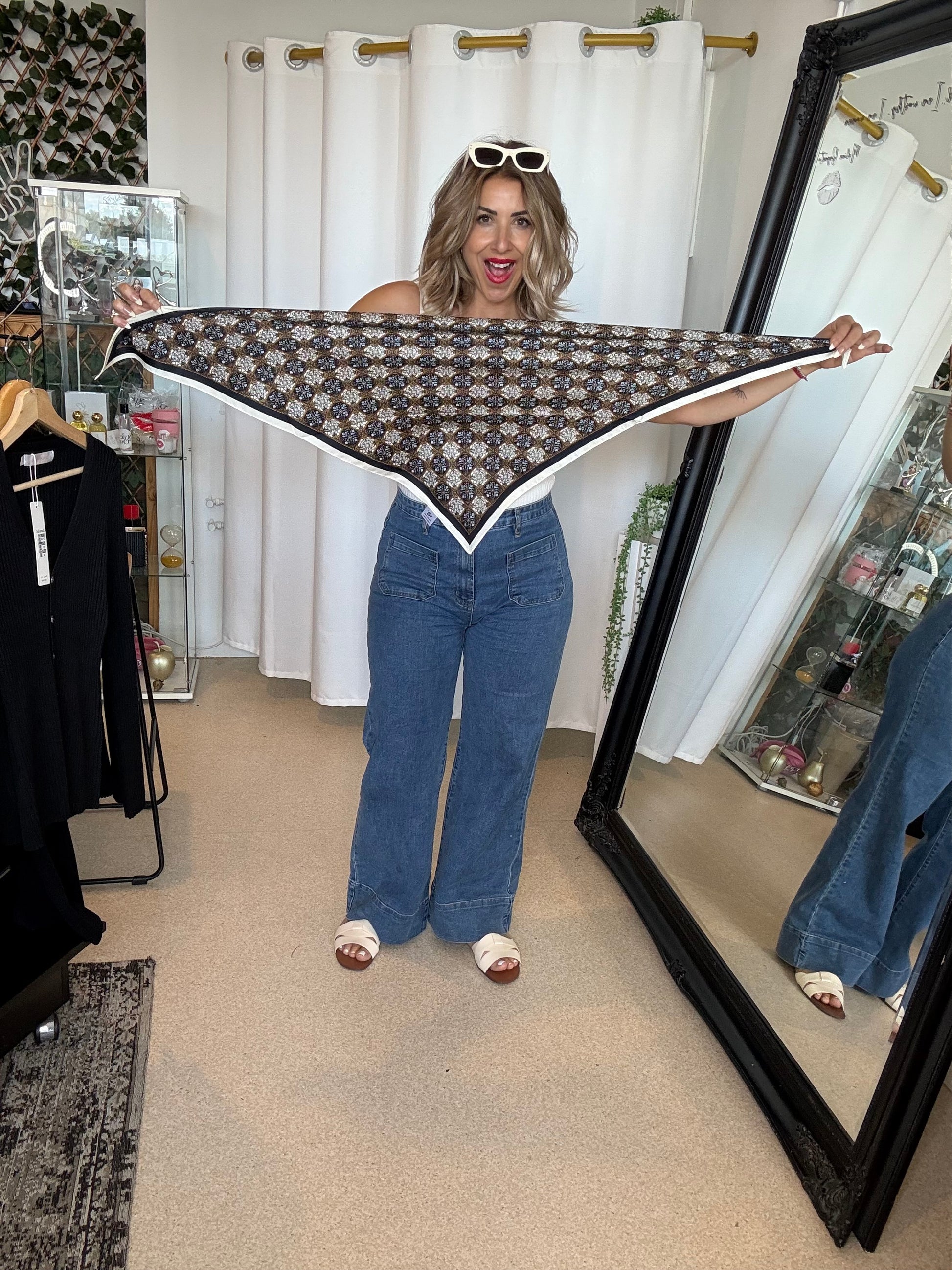 Transform your everyday look with the CRYSTAL scarf—a versatile piece that works as both a stylish accessory and a chic belt. Crafted in a lightweight fabric, this navy and cream floral window design brings effortless fun and personality to any outfit. Whether you drape it around your neck, tie it at your waist, wear it as a handkerchief top with tie back or experiment with creative styling, this multi-purpose scarf delivers endless possibilities. Perfect for adding that finishing touch that makes all the difference.