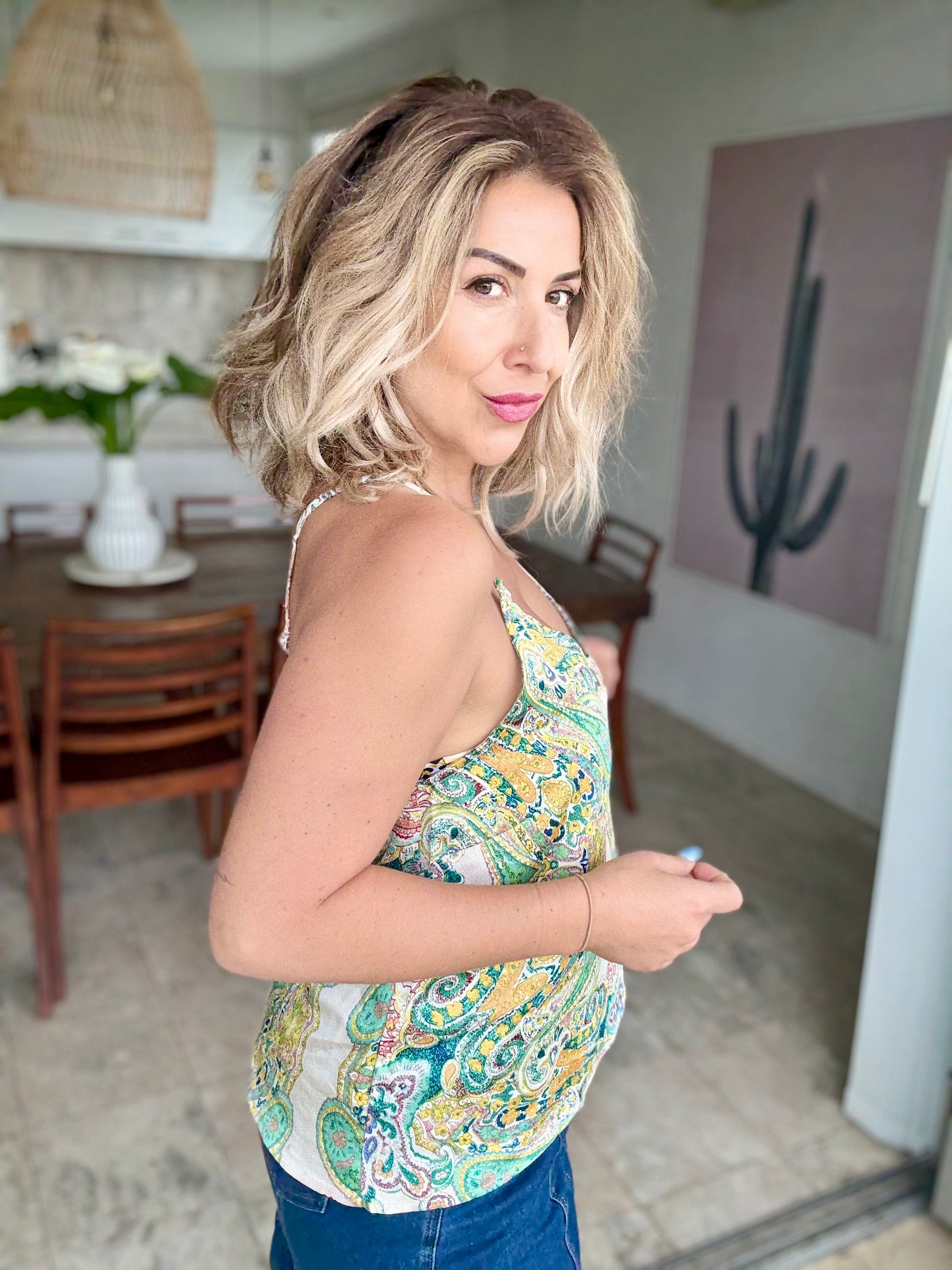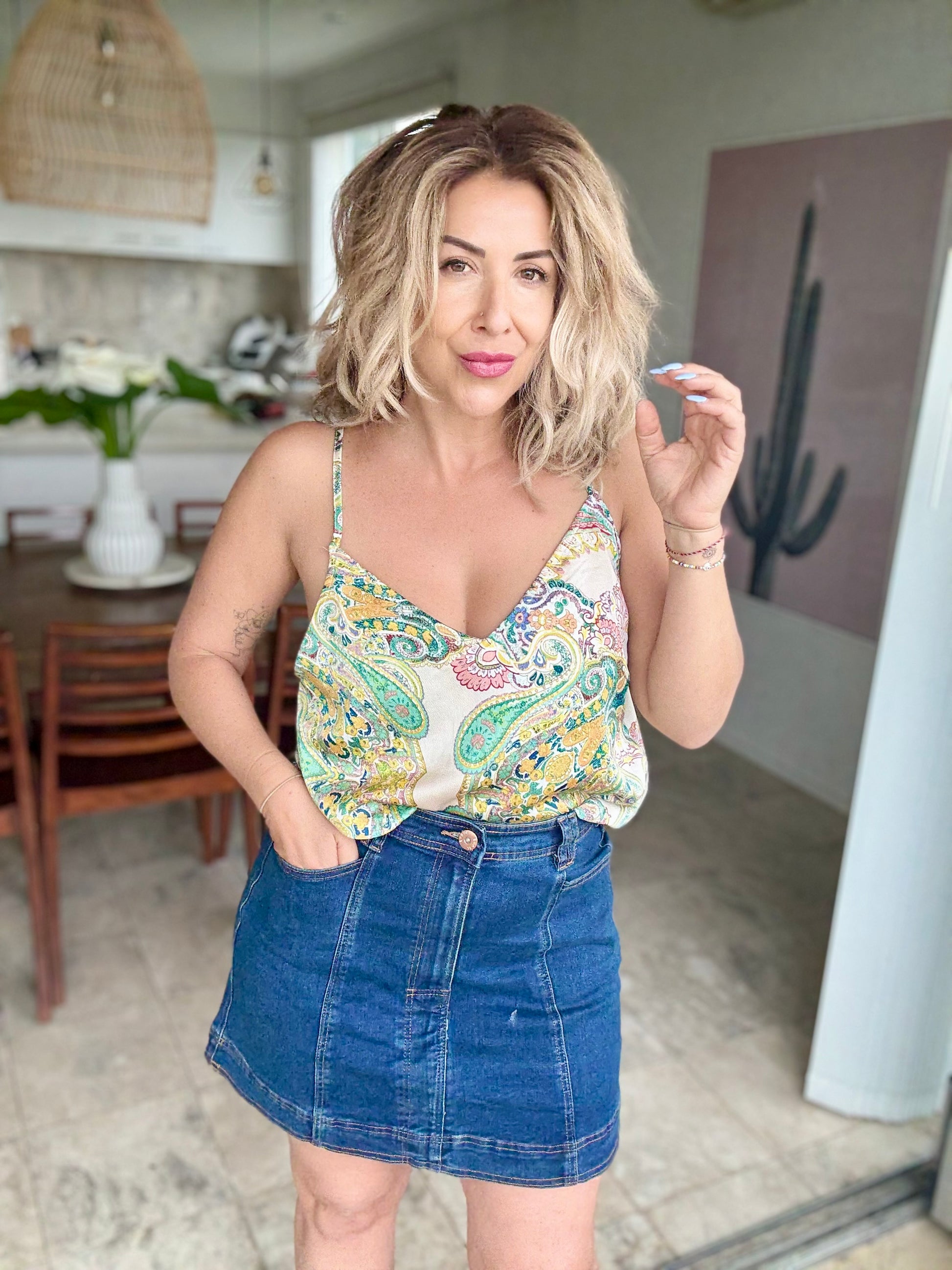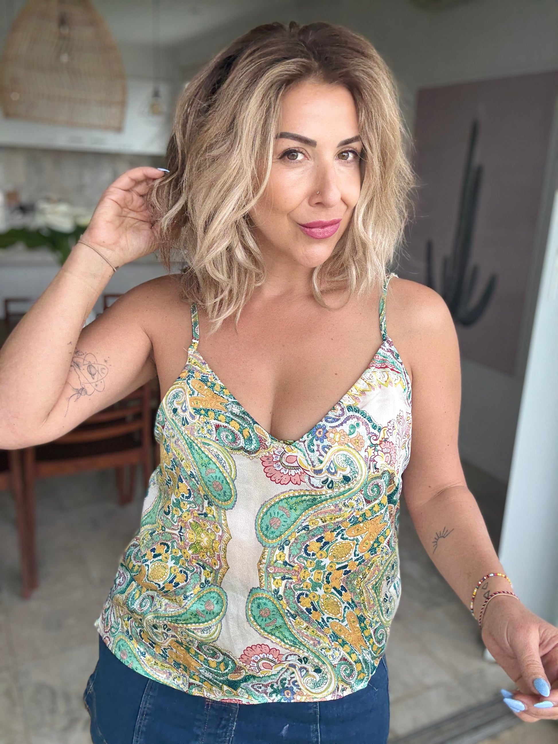 Elevate your wardrobe with the EVA cami top in green paisley print—a lightweight, stylish alternative to the ELENI GREEN. Perfectly designed for effortless transitions from day to night, its breathable fabric ensures comfort while making a chic statement wherever you go. Embrace versatile elegance with this must-have cami.