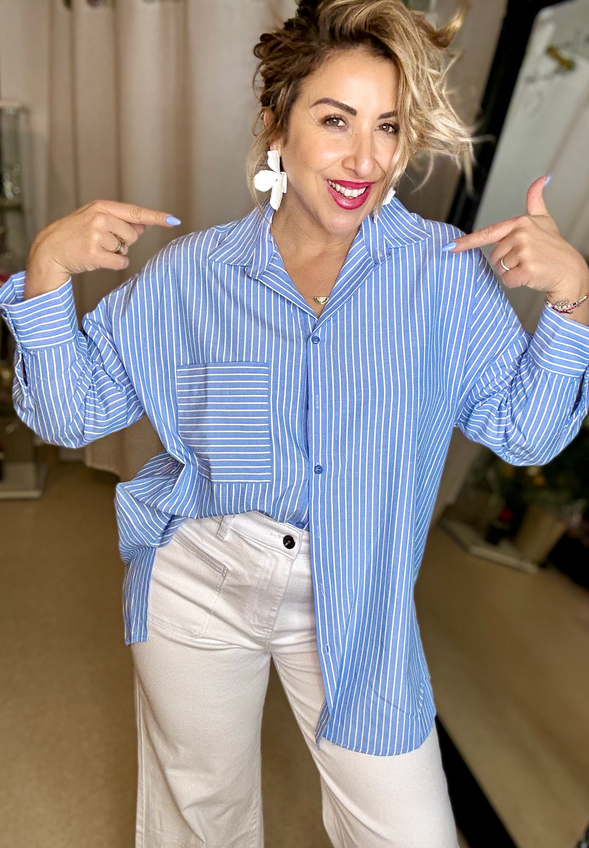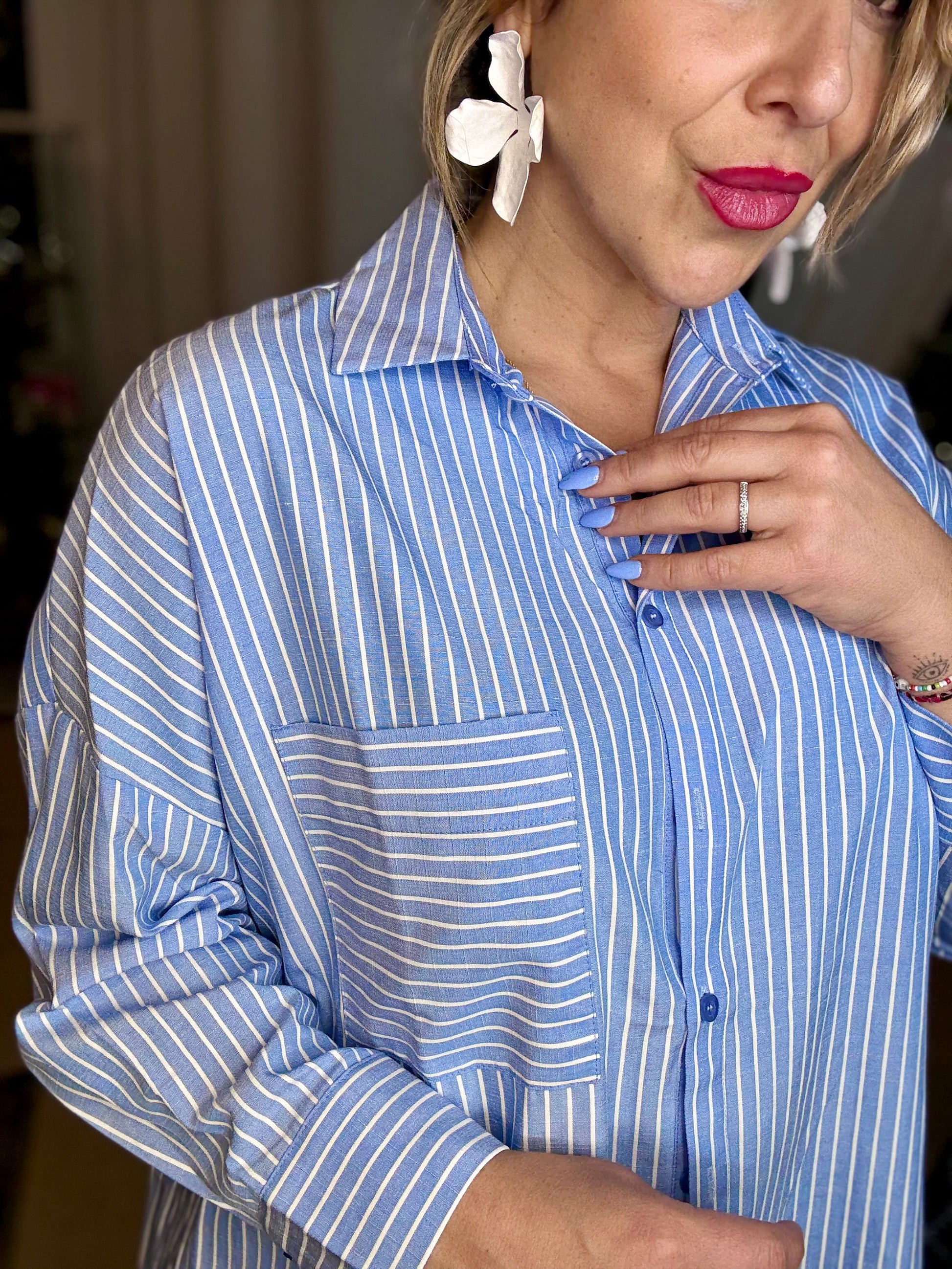 Embrace effortless style with the EVELYN Blue Stripe Shirt, designed in an oversized fit for ultimate comfort and a modern look. Ideal for spring, this versatile piece can be dressed up with tailored pants or down with your favourite jeans, making it a seamless addition to any wardrobe. Its classic blue stripe adds a fresh, timeless touch to your outfits.